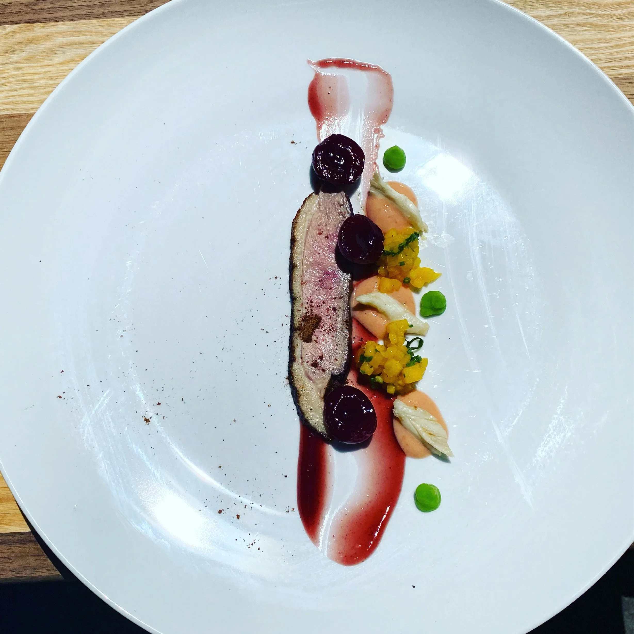 Red Curry Duck | Cherry, Ginger, Garlic Compote, Mint Oil paired with Cherry Bulldog / Gin, Port
